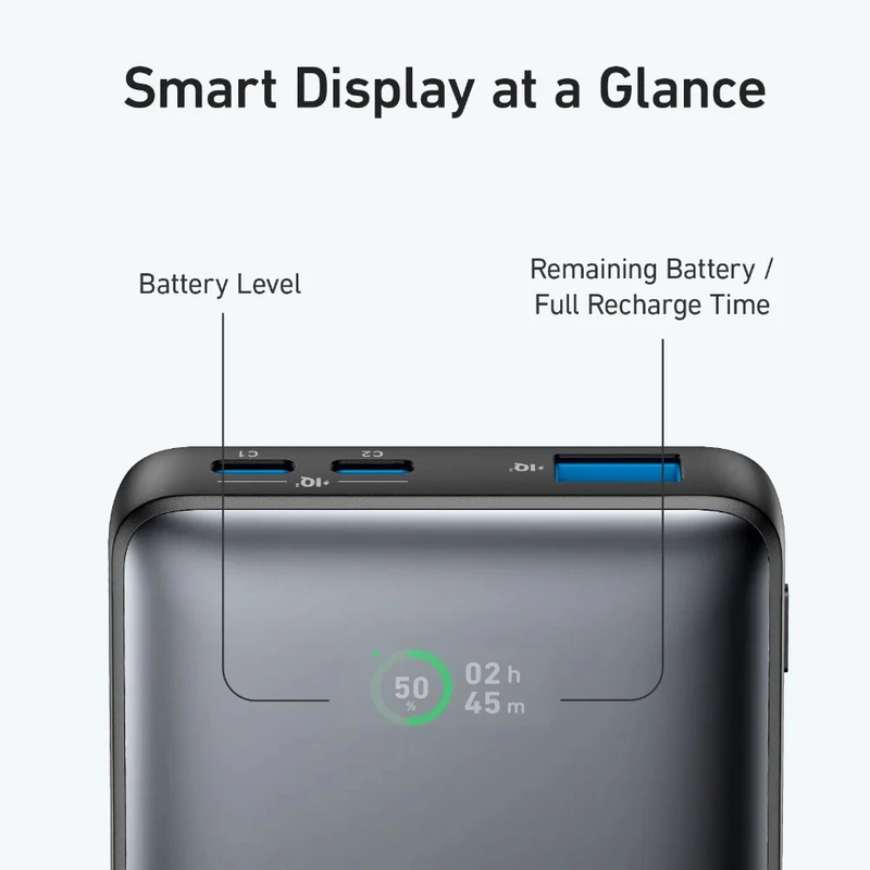 ظرفیت اسمی این پاوربانک ۱۰۰۰۰ میلیآمپرساعت است. البته همانطور که میدانید ظرفیت واقعی از این مقدار کمتر است، اما به هر حال این میزانی استاندارد است که برای استفاده روزمره و معمول کافی خواهد بود. نوع باتری این پاوربانک لیتیوم پلیمری است. این مدل باتری نسبت به مدلهای لیتیوم یونی کمی سبکترند و امنیت بسیار خوبی هم دارند. خیالتان هم از آسیبهای احتمالی راحت باشد، این مدل هم مانند بقیه مدلهای انکر دارای استانداردهای لازم است و در برابر نوسانات ولتاژ، افزایش دمای بیش از حد و موارد مشابه کاملا مقاوم است پس میتوانید بدون نگرانی از کار با آن لذت ببرید. نشانگرLED این دستگاه کمی متفاوت و البته جذابتر است. روی بدنه یک نشانگر دایرهای قرار دارد که در میان آن میزان شارژ باقیمانده به درصد نمایان است. در کنار آن هم زمان باقیمانده نشان داده شده که وقتی پاوربانک را به شارژ بزنید، تبدیل به زمان مورد نیاز برای شارژ کامل خواهد شد.