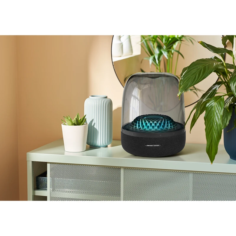قلب تپندهی Aura Studio 4، سیستم صوتی قدرتمند و پیشرفتهی آن است که صدایی فراگیر و ۳۶۰ درجه را ارائه میدهد. این به معنی آن است که اگر اسپیکر را در مرکز اتاق قرار دهید، صدا به طور یکنواخت در تمام جهات پخش میشود و تمام افراد حاضر در اتاق، تجربهی شنیداری یکسانی خواهند داشت. این سیستم صوتی از یک سابووفر قدرتمند ۱۳۰ میلیمتری با توان ۱۰۰ وات که در قسمت پایینی دستگاه و رو به پایین قرار گرفته، و دو درایور میدرنج/توییتر ۴۰ میلیمتری با توان مجموع ۳۰ وات (هر کدام ۱۵ وات) که به صورت استراتژیک برای پخش ۳۶۰ درجه چیده شدهاند، تشکیل شده است. توان خروجی کلی ۱۳۰ واتی این اسپیکر، صدایی بسیار قدرتمند، پرحجم و در عین حال شفاف و با جزئیات را تولید میکند. سابووفر ۱۳۰ میلیمتری، بیس عمیق، کوبنده و کاملا کنترلشدهای را ارائه میدهد که