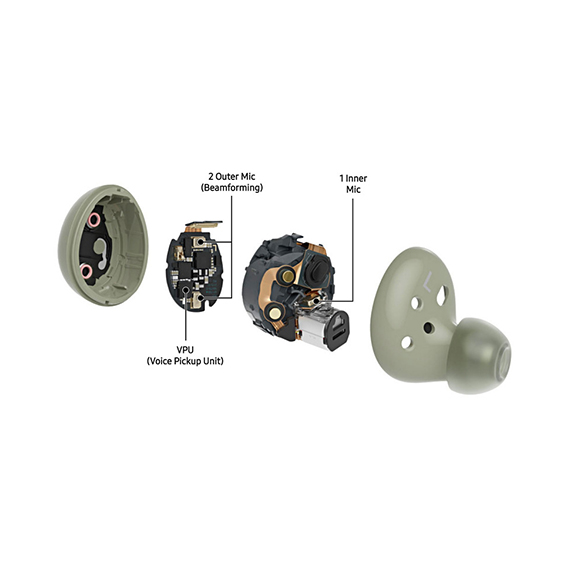 Galaxy Buds 2 دارای میکروفن سهگانه است که به کاربر امکان مکالمهی واضح را میدهد. همچنین این هدفون از فناوری Bixby پشتیبانی میکند و قابلیت شارژ بیسیم دارد. عمر باتری این هدفون در حالت مکالمه ۱۳ ساعت با فعال بودن ANC و ۱۴ ساعت با خاموش بودن ANC است. همچنین در حالت پخش موسیقی، زمان پخش با فعال بودن ANC ۲۰ ساعت و با خاموش بودن ANC ۲۹ ساعت است. این هدفون دارای سنسورهای مختلفی از جمله شتابسنج، ژیروسکوپ، مجاورت، آهنربا و تماسهای لمسیدست است. همچنین دارای سه عدد میکروفن برای بهبود کیفیت صدا و اسپیکر دوگانه با ووفر و توئیتر برای تجربهی صدای بهتر است. این هدفون همچنین از کدکهای صوتی Scalable (اختصاصی سامسونگ)، AAC و SBC پشتیبانی میکند و دارای سیستمعامل RTOS است.