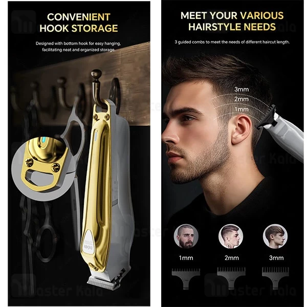 Sharp 5 با در نظر گرفتن ساعات طولانی استفاده توسط آرایشگران یا استفاده دقیق خانگی، به صورت کاملاً ارگونومیک طراحی شده است. وزن دستگاه به خوبی بالانس شده و به راحتی در دست جای میگیرد، به طوری که شما کنترل کاملی بر روی زوایا و حرکات خود دارید. این کنترل دقیق برای ایجاد خطوط تمیز ریش، مرتب کردن خط موی پشت گردن یا اجرای طرحهای خلاقانه روی مو، حیاتی است. در انتهای بدنه نیز یک قلاب آویز فلزی و کاربردی تعبیه شده که برای استفاده در آرایشگاهها یا آویزان کردن دستگاه در حمام، بسیار ایدهآل است.