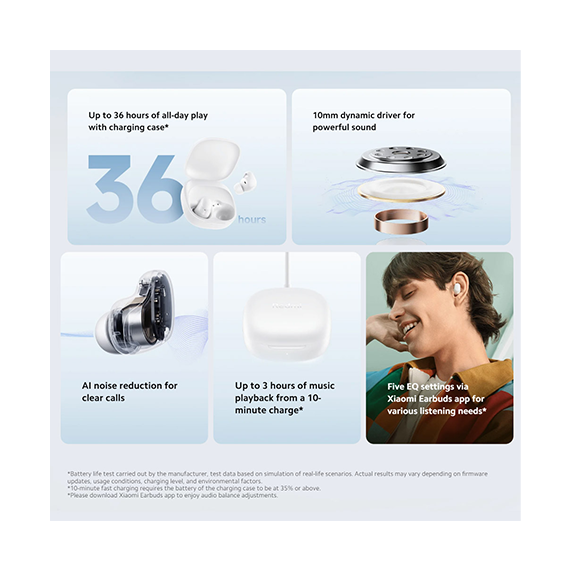 در هندزفری Redmi Buds 6 Play از میکروفون هایی استفاده شده است که به صورت هوشمند برای حذف نویز عمل می کنند و با توجه به مکانی که در آن قرار دارید نویز را حذف کرده و صدای کاملا شفاف و با کیفیتی را منتقل می کنند.